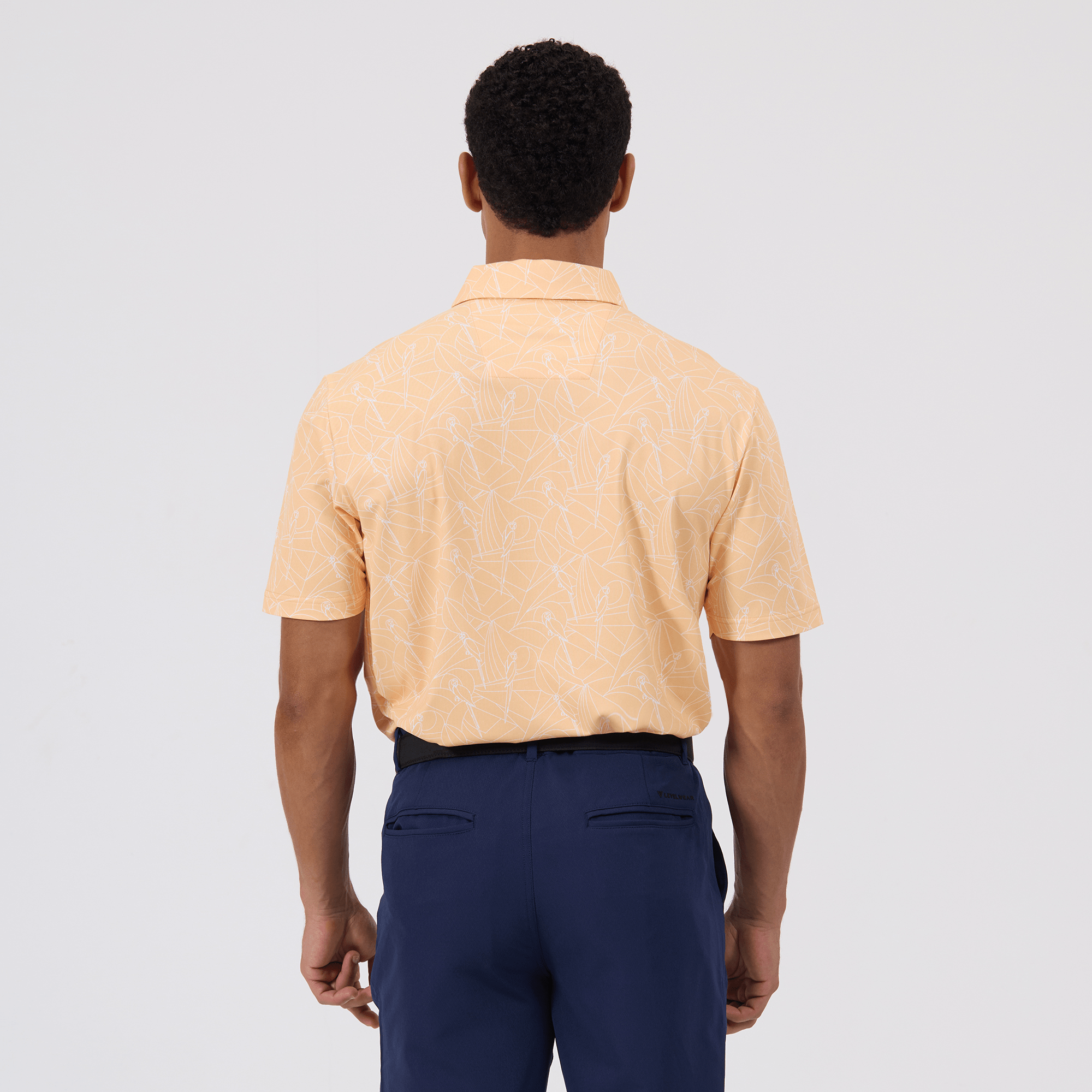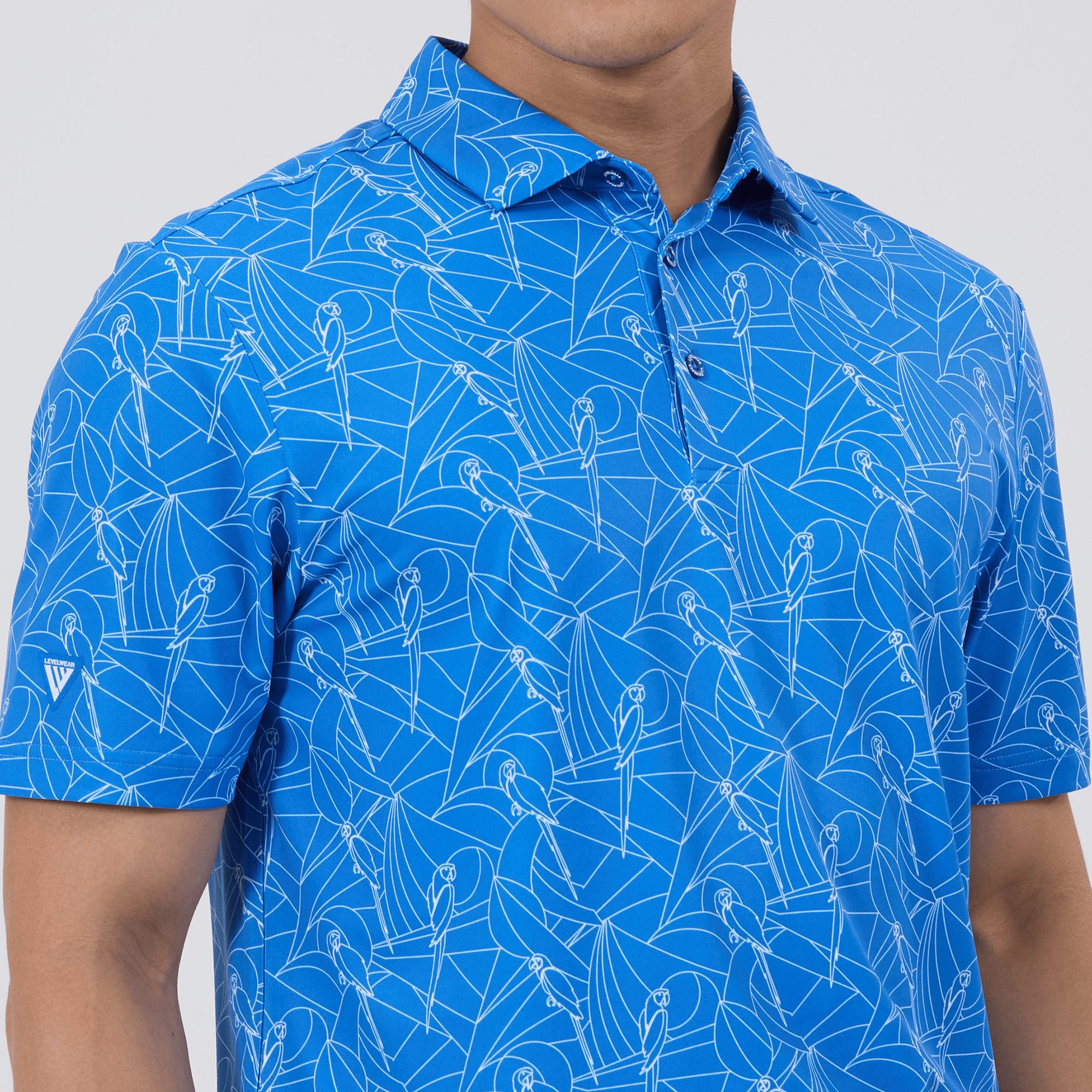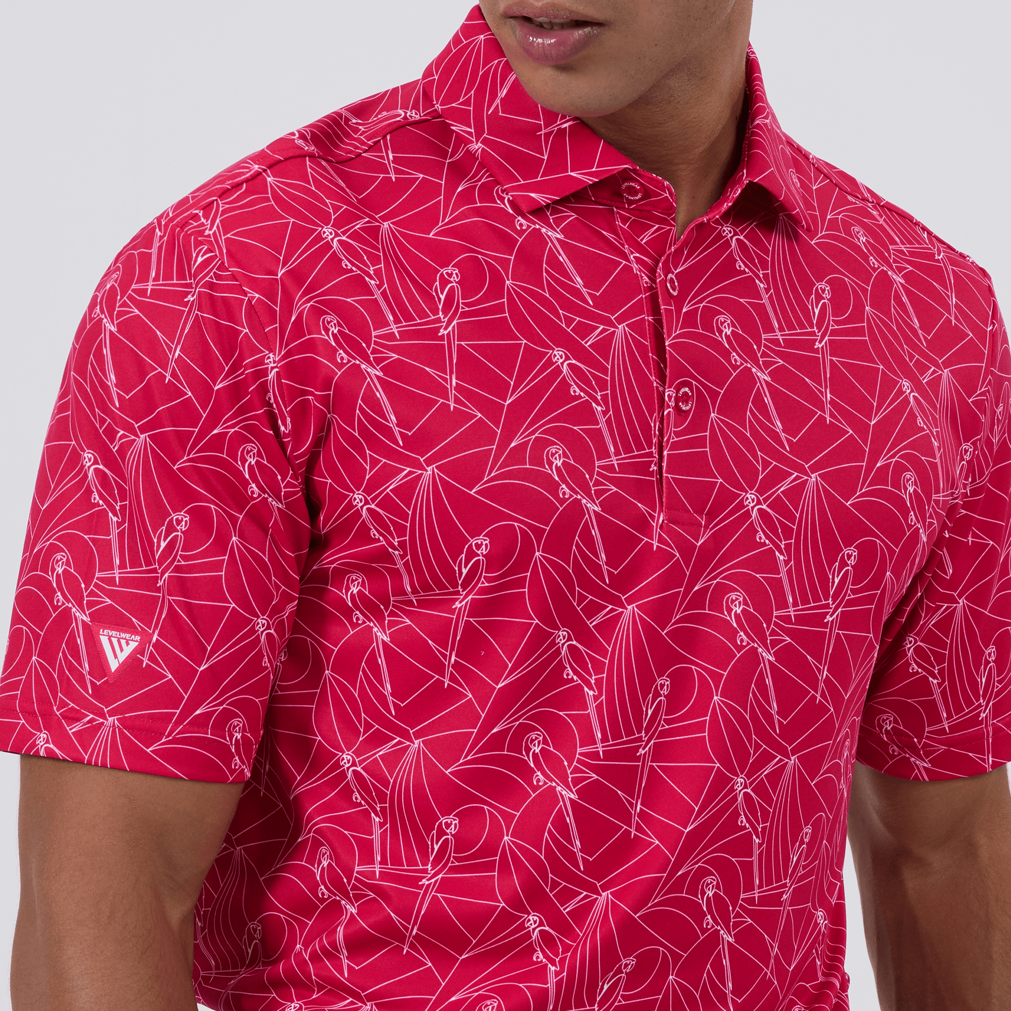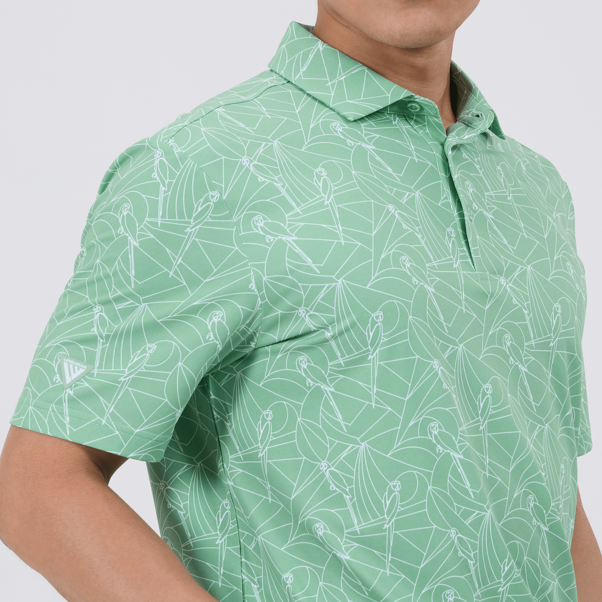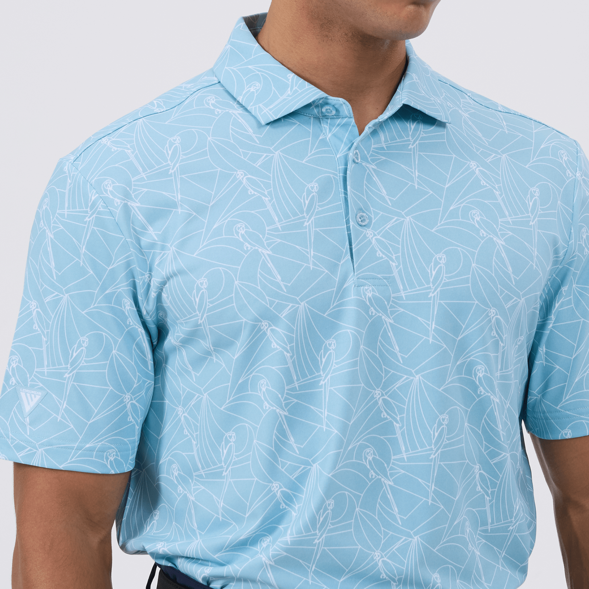 Hit the links with flair in the men's Paradise golf polo, featuring a fun and eye-catching all-over parrot print that's sure to turn heads. This polo is crafted from a blend of 93% polyester and 7% spandex, combining comfort with stretch for unrestricted movement on the golf course. It's equipped with UPF 50+ to protect you from the sun's rays and moisture-wicking technology to keep you dry and cool as you play. The self-fabric collar with built-in collar stay ensures your look remains crisp, while the high-low hem with side slits provides enhanced mobility and a modern fit. Ideal for golfers who want to stand out while staying protected and comfortable, this polo is a stylish addition to your golfing wardrobe.