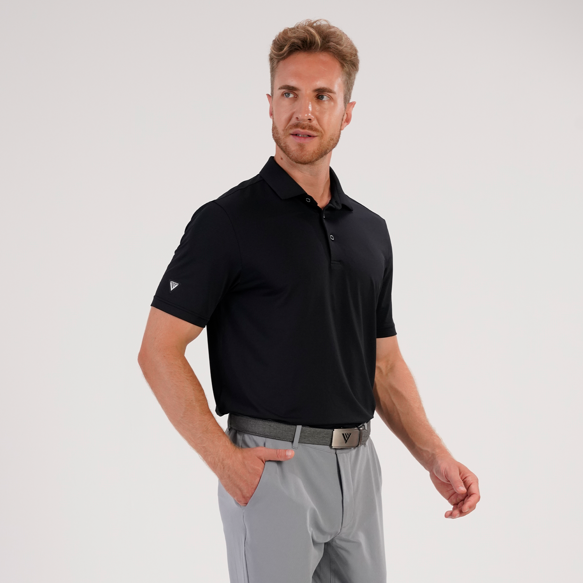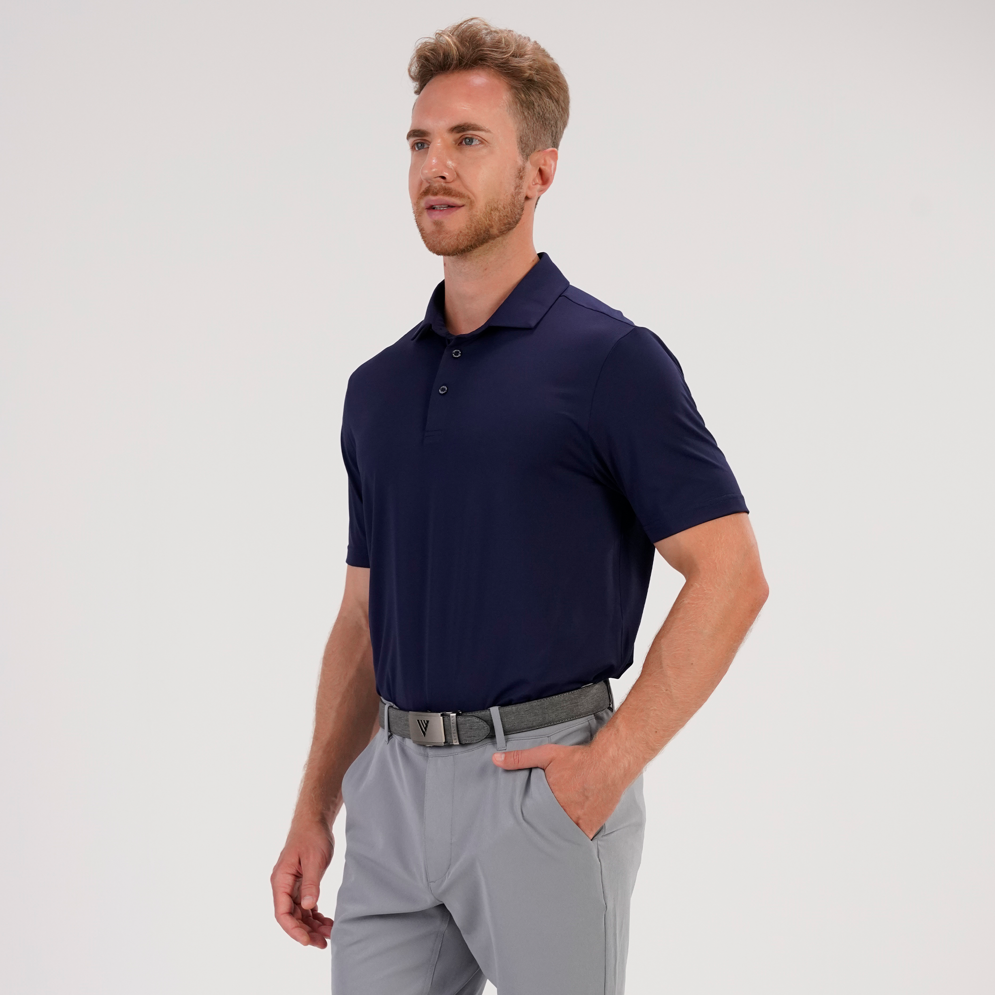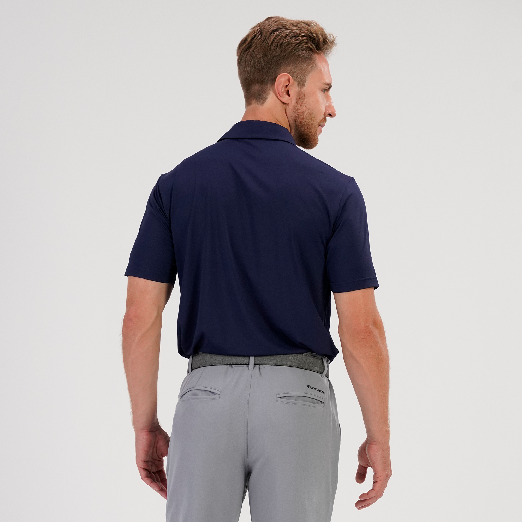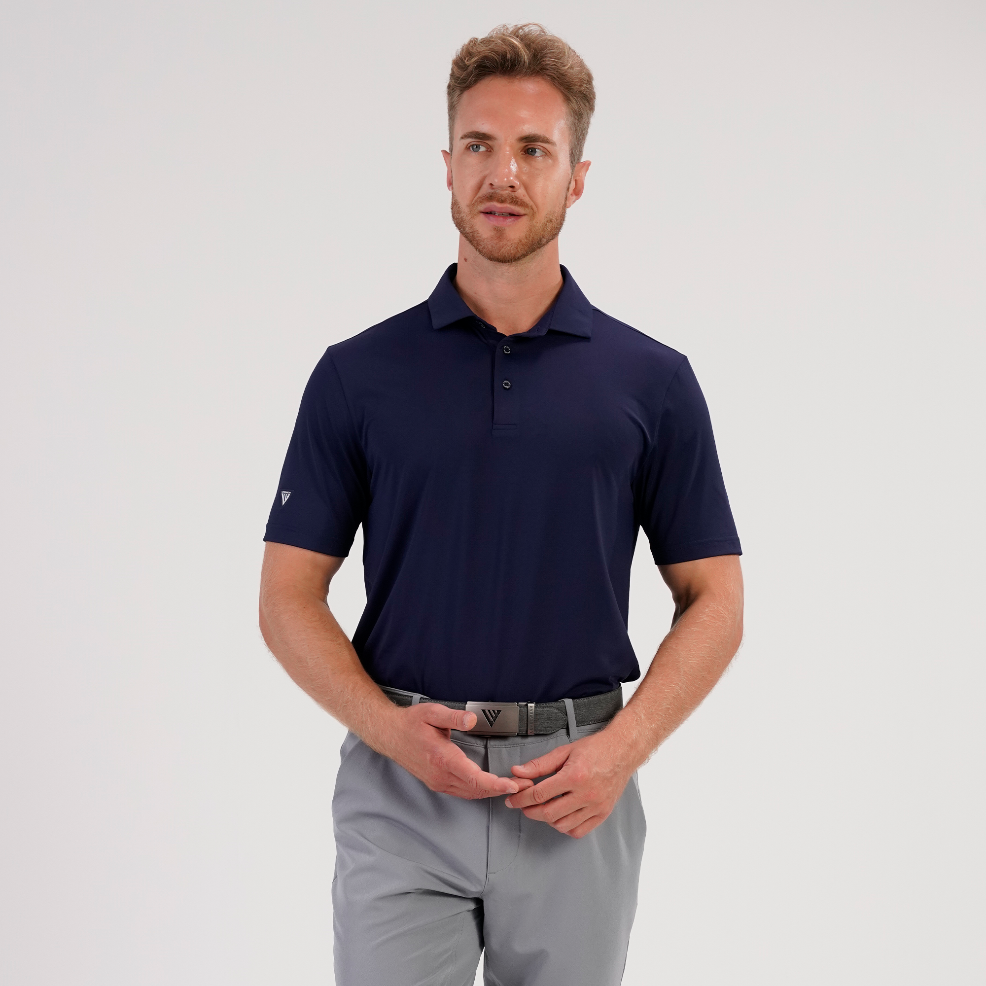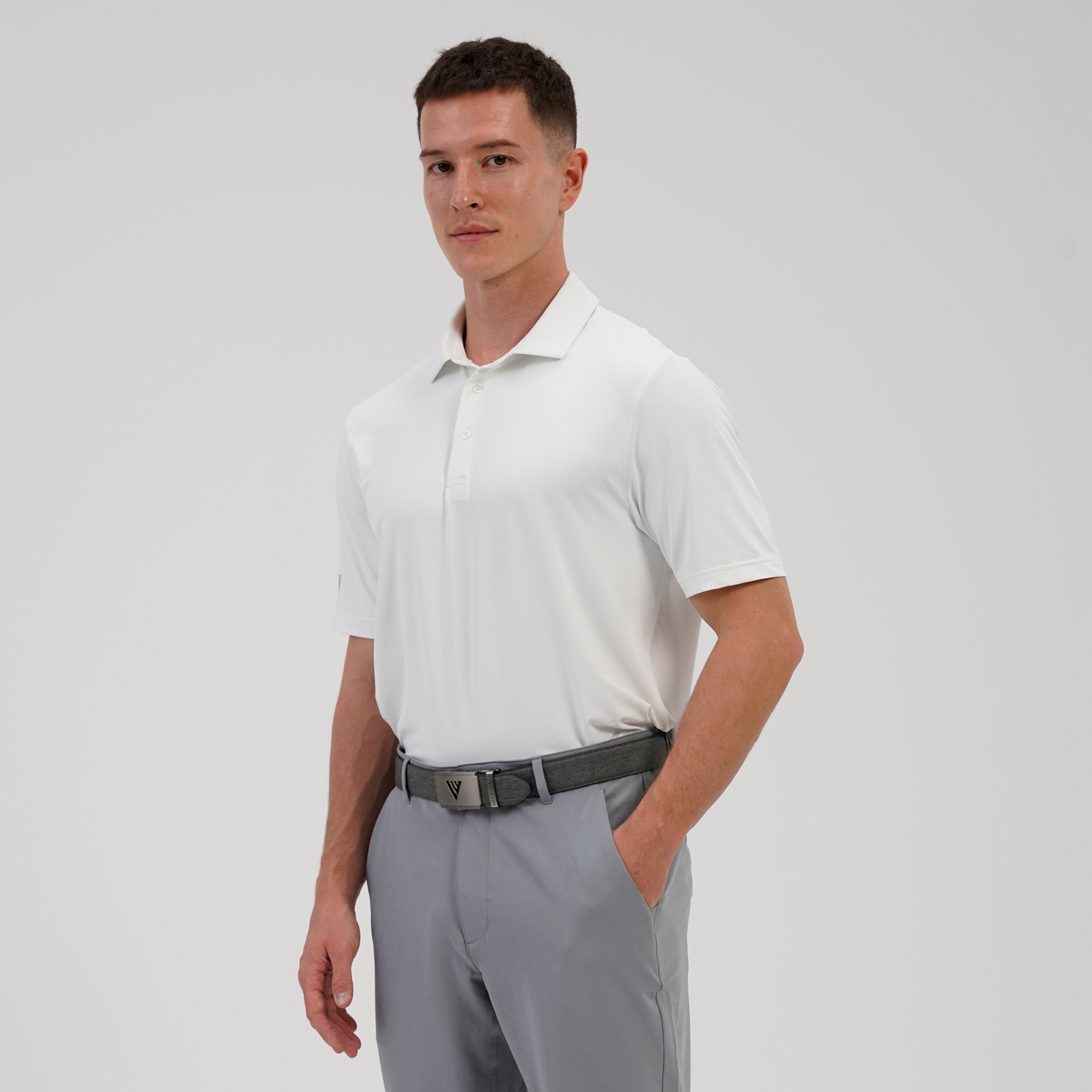 The Versa golf polo is built for on-course performance with moisture-wicking, anti-bacterial jacquard fabric that keeps you fresh and dry. Designed with a self-fabric collar and built-in collar stay, plus forward shoulder seams for added mobility. Made from 91% recycled polyester and 9% spandex for stretch and sustainability.